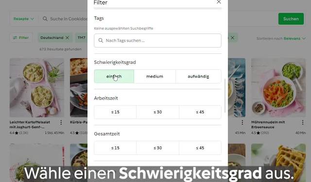 Schwierigkeitsgrad, Arbeitszeit und Gesamtzeit: Du beginnst gerade erst mit dem Kochen oder hast gerade nicht viel Zeit? Kein Problem! Mit diesen drei Filtern kannst du auswählen, ob du ein einfaches und schnelles Rezept suchst oder Lust auf ausgedehntes Kochen mit mehr Anspruch hast.
