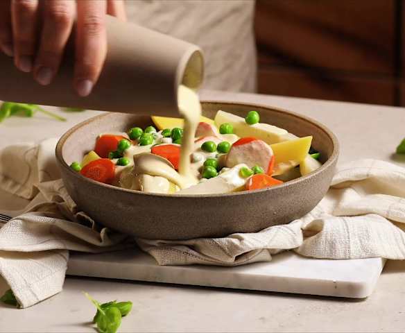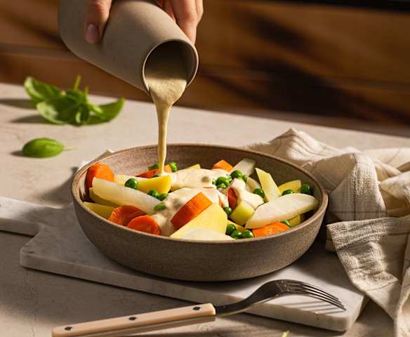 Ziemniaki z warzywami i sosem serowym