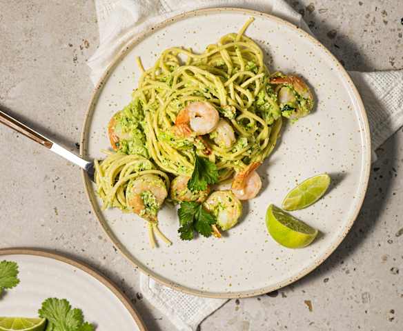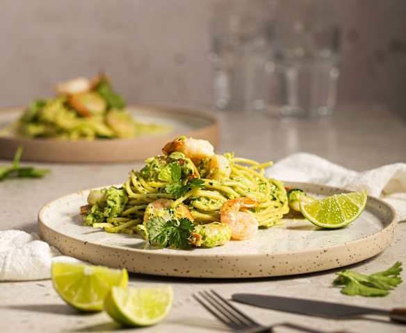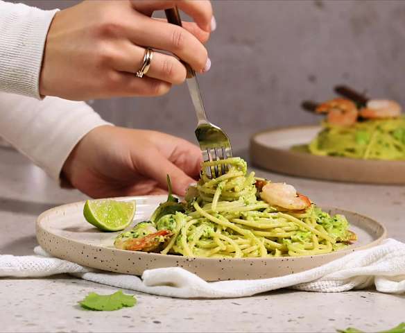 Makaron z krewetkami i szpinakiem