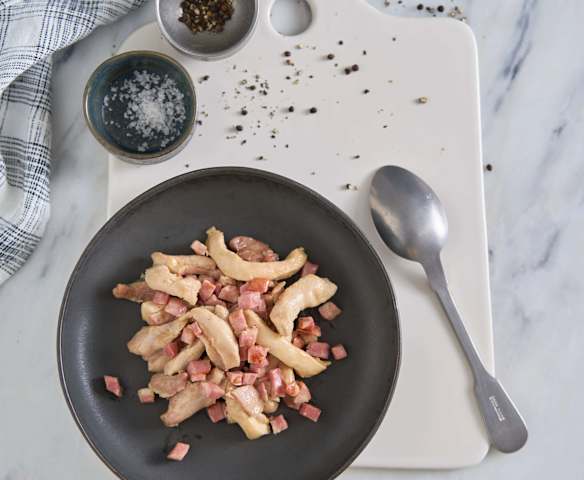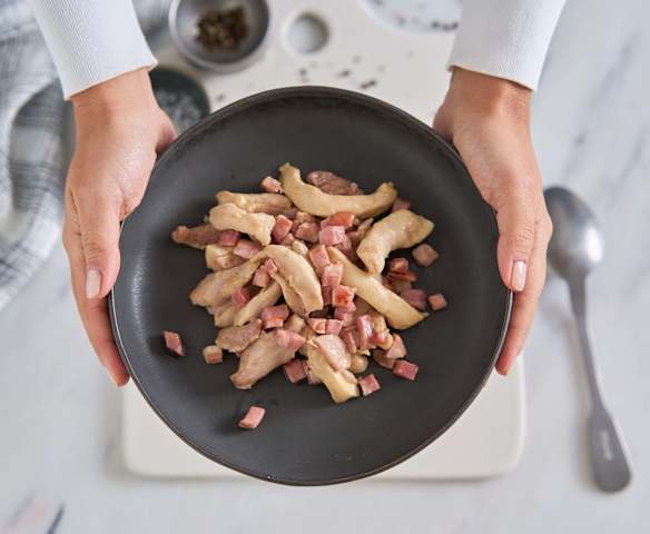 Saltear bacon com frango em tiras