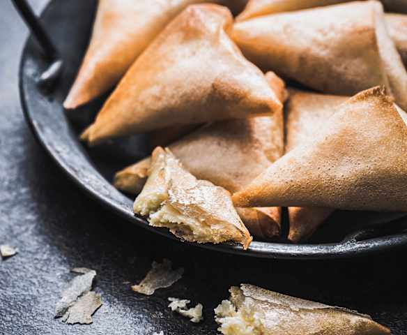 Samoussa de boeuf, coriandre, oignons, sauce cheddar
