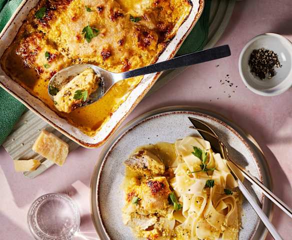 Ofenschnitzel mit Champignon-Porree-Sauce