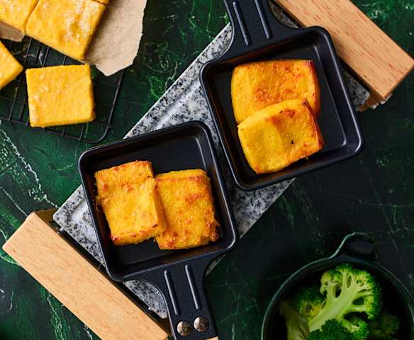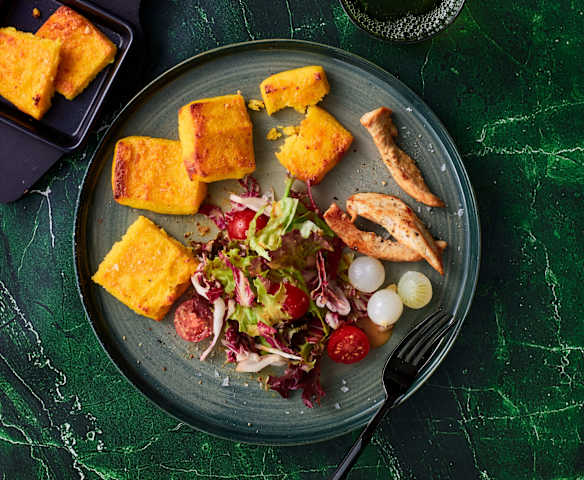 Parmesan-Polenta-Rauten als Beilage zu Tomaten-Paprika-Pisto