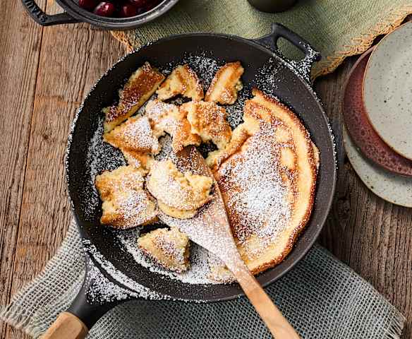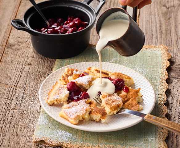 Veganer Kaiserschmarrn mit heißen Kirschen und Vanillesauce