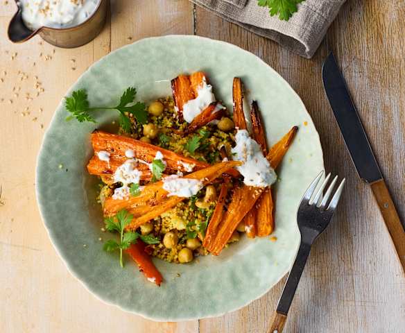 Smashed Carrots mit Sesam-Joghurt-Creme
