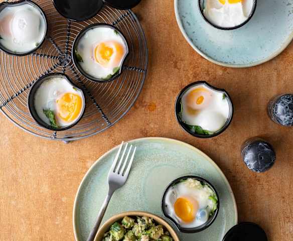 Zielone szparagi z łososiem i jajkami w koszulkach