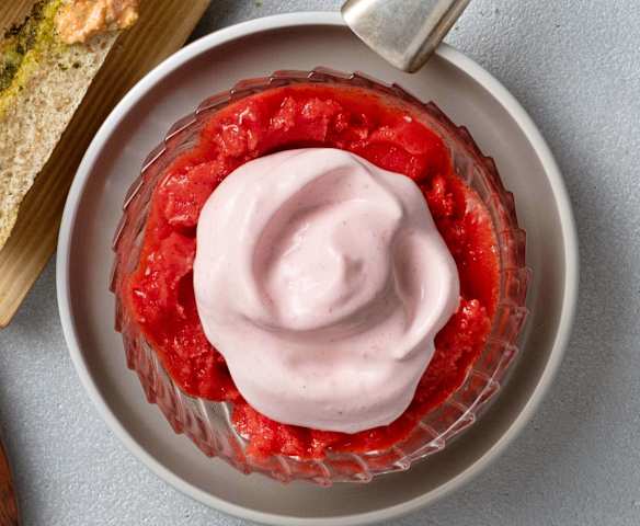 Menü: Vollwert-Focaccia mit Tomaten-Feta-Dip, Erdbeertraum